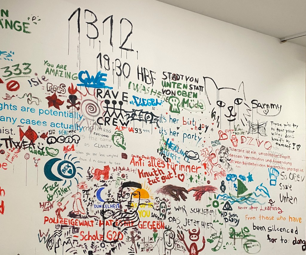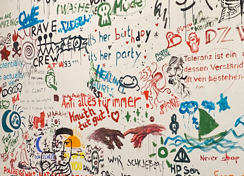 nehmen schreibend und zeichnend Gestalt an. Auf einer großen Fläche entstehen visuelle Reflexionen, die als fahnenartiges Objekt Stück für Stück nach oben gezogen werden. Hierbei stehen Stifte und Pinsel in allen Farben zur Verfügung. Das Ergebnis ist ein partizipativer, fortlaufender Prozess, der zum Nachdenken und Mitwirken einlädt. (Um Anmeldung wird gebeten: dagmarrauwald@gmx.de)
