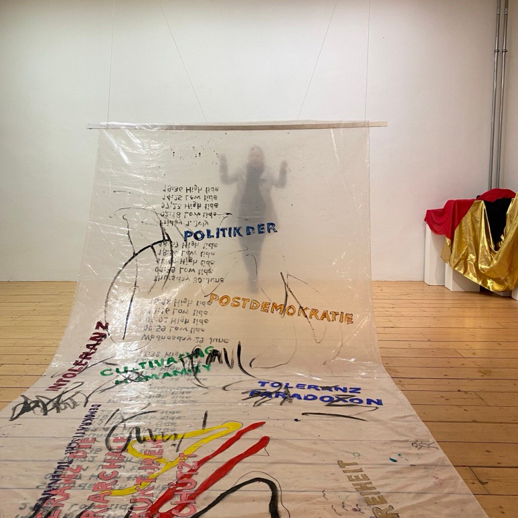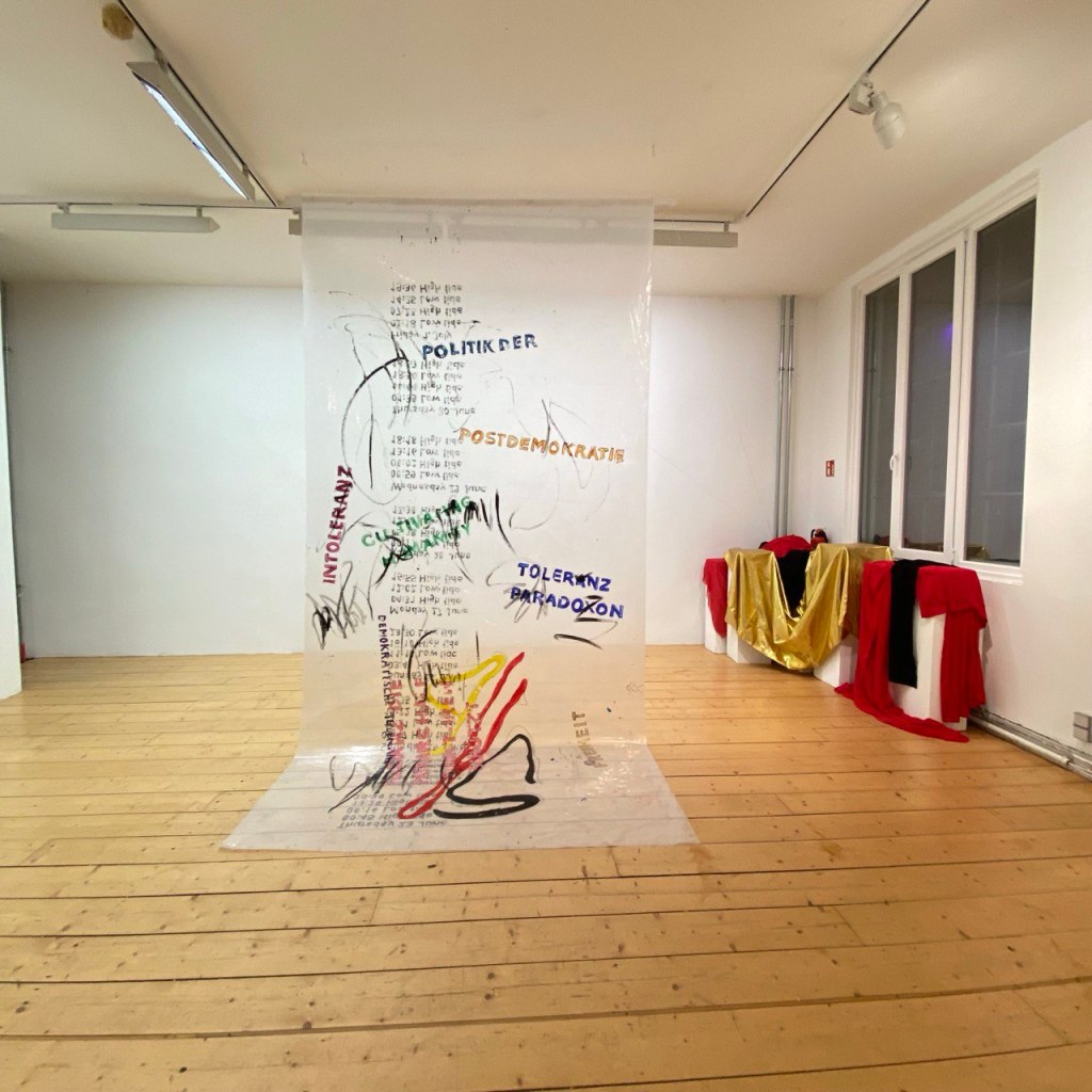 In Zeiten post-demokratischer Wirren wollen wir Fragen stellen und Formen neuer Begegnungen erproben, diskutieren und möglicherweise künstlerische Antworten finden. Welche Historie steckt in den deutschen Nationalfarben SchwarzRotGold und lassen sich auf den Pfaden aus der Kunst Haltungen angesichts dieses identitär-ideologischen Instruments schöpfen?